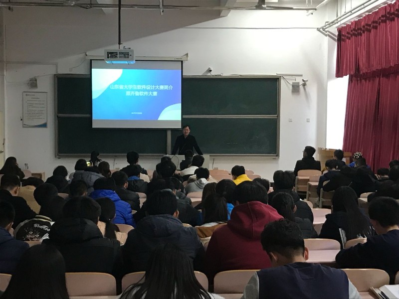 会议开始,曾庆尚老师从"赛事简介,命题介绍,评判标准"三个方面向同学们介绍软件大赛,使学生们对软件大赛有了大致的了解,他鼓励同学们要积极参加,从枯燥的代码中发现乐趣。随后,由第十五届山东省大学生软件设计大赛获奖的团队代表依次上台向大家介绍自己的参赛作品,他们分别从互联网+,游戏开发,大数据等方面给大家做了详细阐释,不管是页面的设计、前后台的连接还是页面的友好交互都吸引了在座同学的眼球,极大的提高了同学们的参赛热情。最后,计算机教研室主任高慧老师总结发言,她指出,大家要认真学习上届优秀团队的方式方法,借鉴他们的不足,汲取经验教训,不要在同一个地方跌倒两次。她还强调既然学校给了我们这么良好的学习平台,大家就要利用起来,锻炼自己,在此过程中不但可以增长见识,开阔视野,而且会为自己的大学生活增添一笔绚丽的色彩。