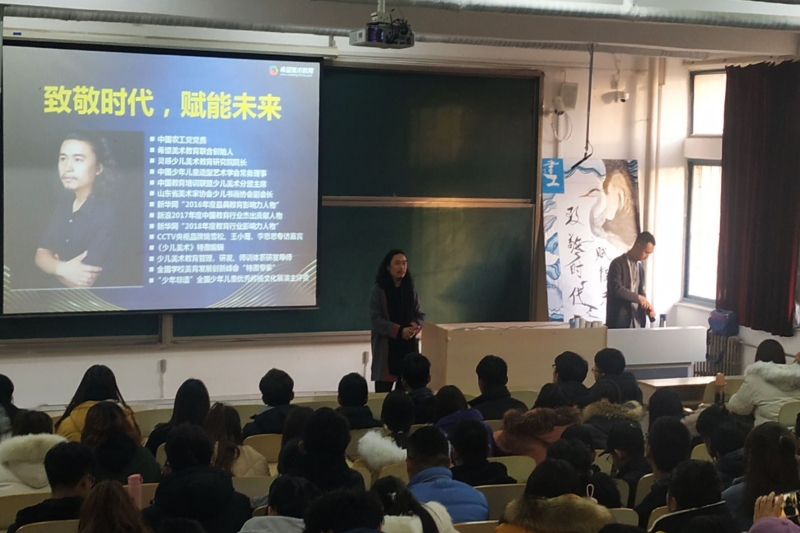 史金良老师是中国少年儿童造型艺术学会常务理事、灵感少儿美术教育研究院院长、山东省美术家协会少儿书画协会副会长、希望美术教育创始人等,专业理论知识扎实,社会实践经验深厚。史老师结合现今美术就业前景及形势分析,以多组数据直观展示艺术行业的发展前景,向同学们传授了如何抓住商机,如何站在社会需求的角度上分析如何选择自己所从事的行业。