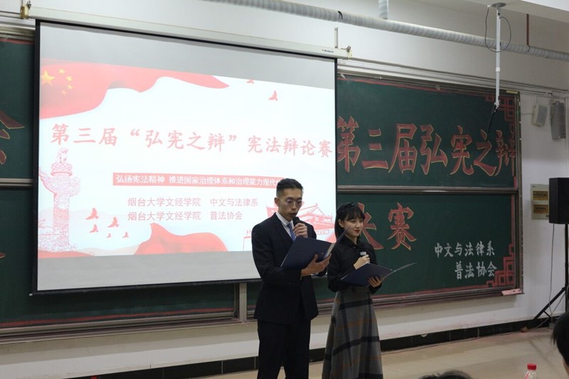 为贯彻落实国家“宪法宣传周”活动,围绕“弘扬宪法精神,大力推进国家治理体系和治理能力现代化”这一主题。中文与法律系法学专业教研室和普法协会特此借第六个国家宪法日到来之时,于12月7日在一教103教室成功举办了第三届“弘宪之辩”宪法辩论赛决赛。法学教研室主任、普法协会指导老师吴淑霞老师,学院办公室、中1901-1班班主任刘思勋老师出席了本次比赛,同时邀请了学院其他系辩论赛队员和2018级、2019级法学专业学生观看了本次比赛。