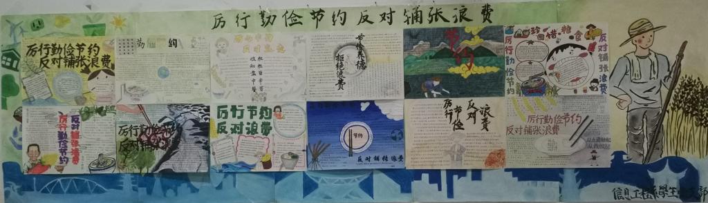 “一粥一饭,当思来之不易;半丝半缕,恒念物力维艰”。为弘扬中华民族勤俭节约的优良传统,大力宣传节约光荣的思想观念,努力使学生养成厉行节约、反对浪费的习惯。信息工程系于11月举行了以“厉行勤俭节约,反对铺张浪费”为主题的班级手抄报展览活动。