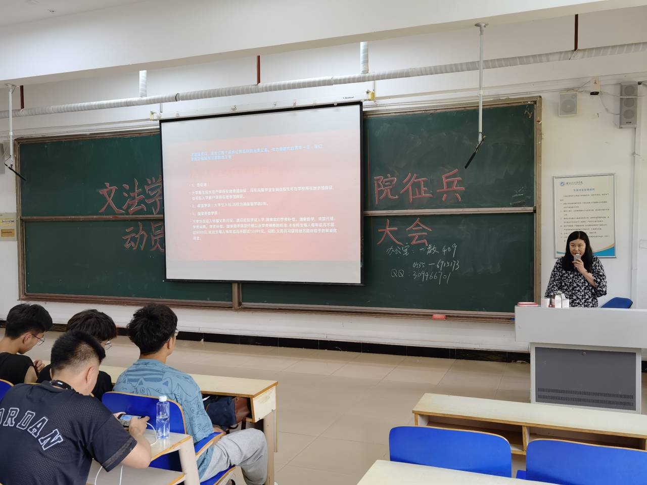 为进一步宣传国家关于大学生征兵入伍的相关政策,调动学生参军入伍的积极性。近期,文法学院于一教101举办征兵交流动员大会,梁丹老师向大家讲述参军政策,文法学院全体男生参加会议。