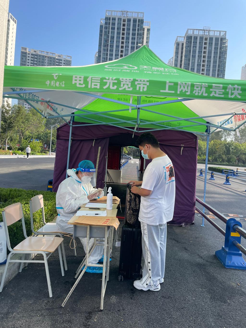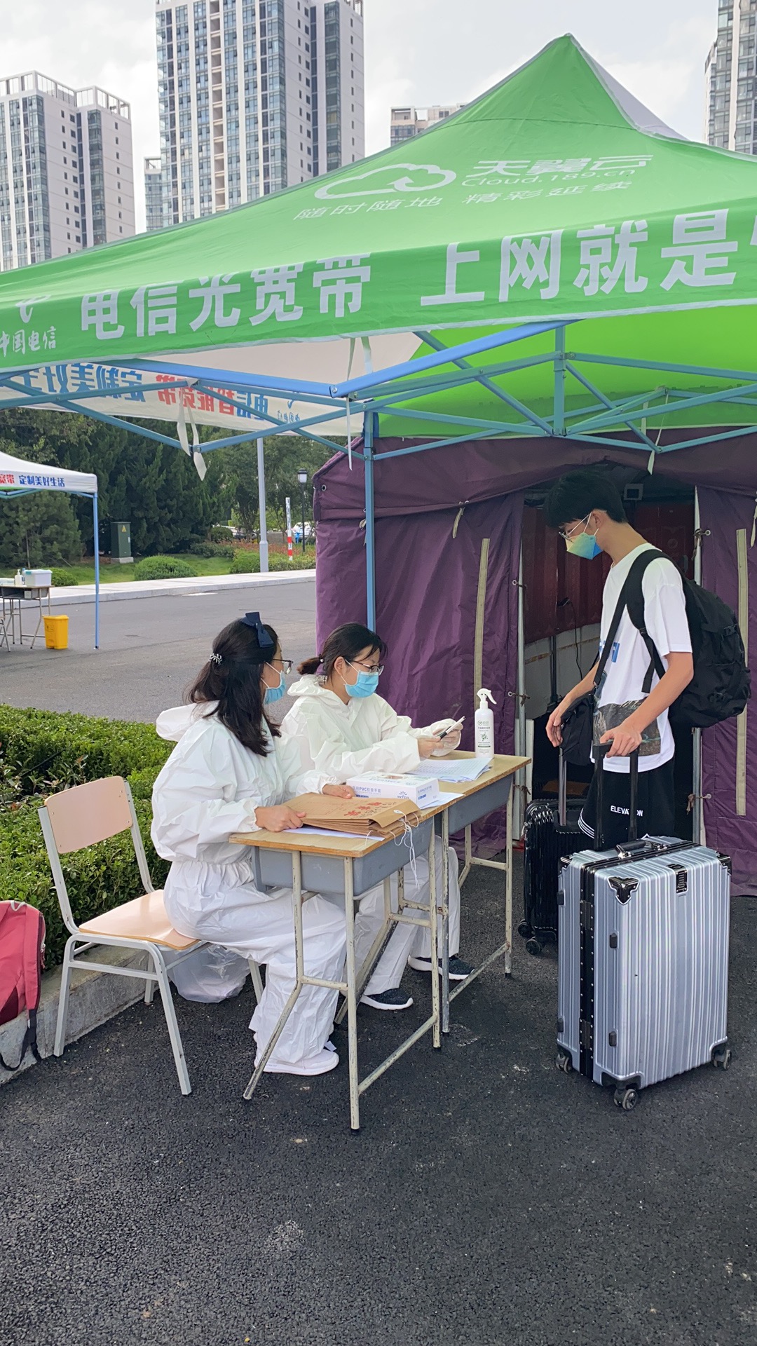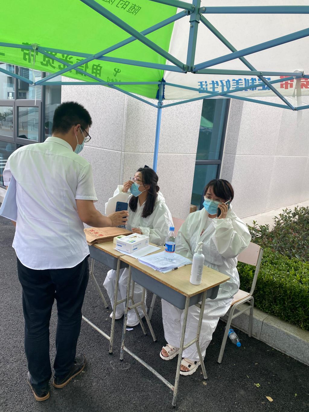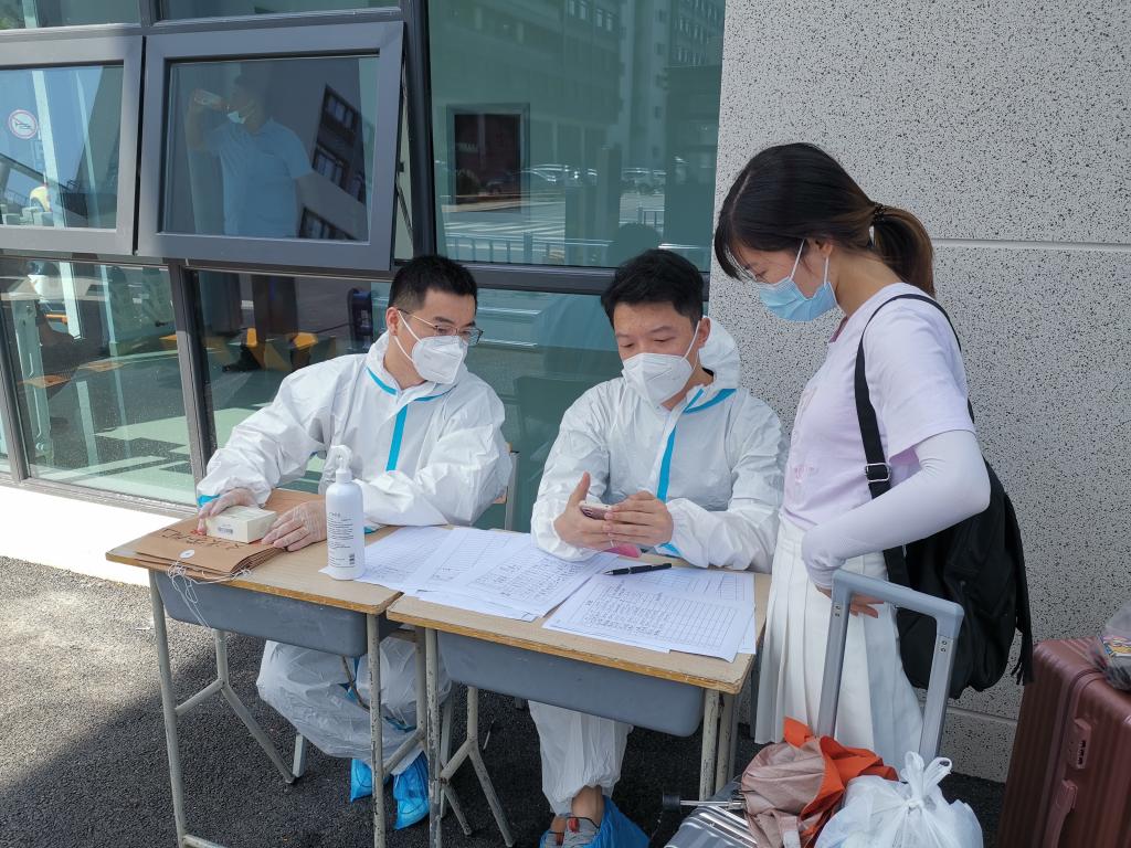食品与生物工程学院的老师们首当其冲,投身一线,全体教师党员积极发挥先锋模范作用,非教师党员也积极报名参与。炎炎夏日,老师们身穿防护服、戴着口罩、面罩、手套等,武装整齐地在专用通道等待省外返校学生的归来,为他们测体温、检查健康码、查看14天行程、收取核酸检测报告等。老师们认真工作,学生们秩序井然,按地面标识的“一米线”排队进行体温检测、身份核验、上交携带的核酸报告、再次接受核酸检测。