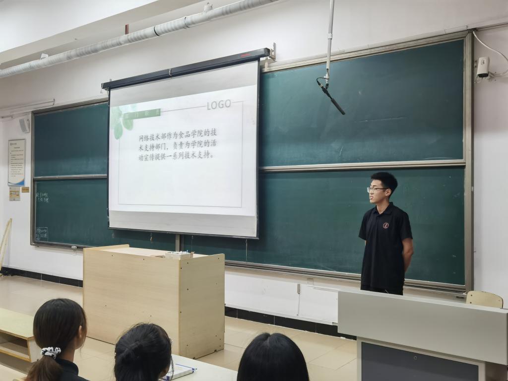 会议开始,团总支书记王晶上台发言,鼓励新生积极报名加入学生会、团总支、组织宣传部等部门,希望大家在学习之余能够多参加学生组织,从中培养兴趣爱好、锻炼工作能力、提高综合素质,为食品与生物工程学院学生工作奉献自己的一份力量。随后,学生骨干代表相继发言,精心准备的宣传材料逐一展现在大屏幕上,一张张精心制作的PPT,一句句幽默诙谐的话语,一段段精彩生动的视频,充分调动了新生们的积极性,这也体现出食品学子们积极向上的精神风貌,再次激发了新生们加入学生组织的热情。