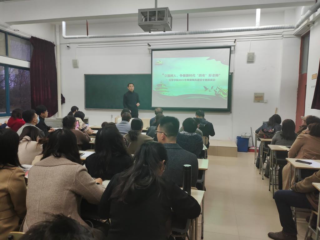 为落实《关于加强和改进新时代师德师风建设的意见》,全面提升教师思想政治素质和职业道德水平。11月18日,经济管理学院于一教楼211室举办以“立德树人,争做新时代‘四有’好老师”为主题的师德师风建设专题座谈会,学院全体教职工参与此次会议。
