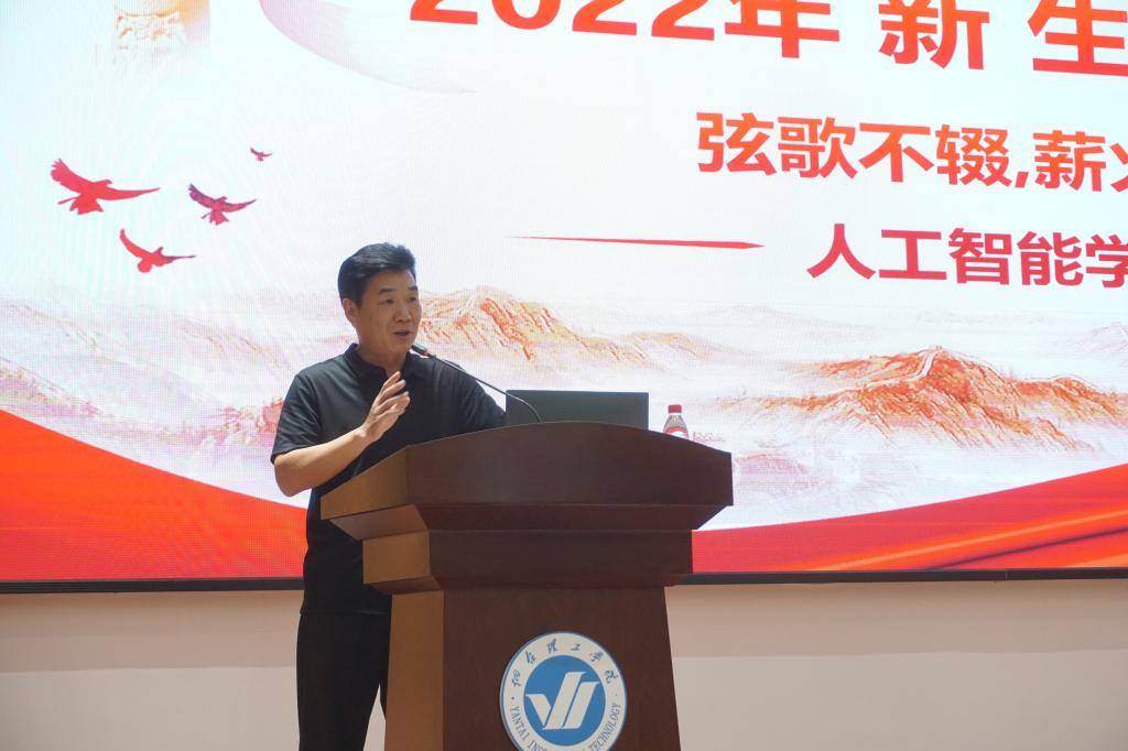 首先,糜玉林向全体新生致欢迎词,他从学院概况、师资队伍、学科特色、教学资源及学生发展等方面详细介绍了学院的基本情况。他希望同学们在四年的时间中,学会规划生活,多方面提升自己的综合能力和水平。他强调,作为人工智能学院的学子,要认清这个时代,要在的信息化、智能化社会中找准自己的定位,真正做到以梦为马不负韶华。