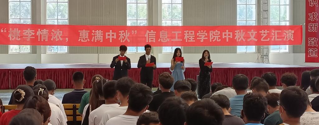 为营造欢乐喜庆、温馨祥和的节日氛围,让新生感受到中秋佳节文化底蕴,进一步增强班级凝聚力。9月10日下午,信息工程学院在文体中心组织举办了“桃李情浓,惠满中秋”中秋节文艺汇演,团总支书记祝箐、全体辅导员及班主任老师、各位教官一起欢度中秋。