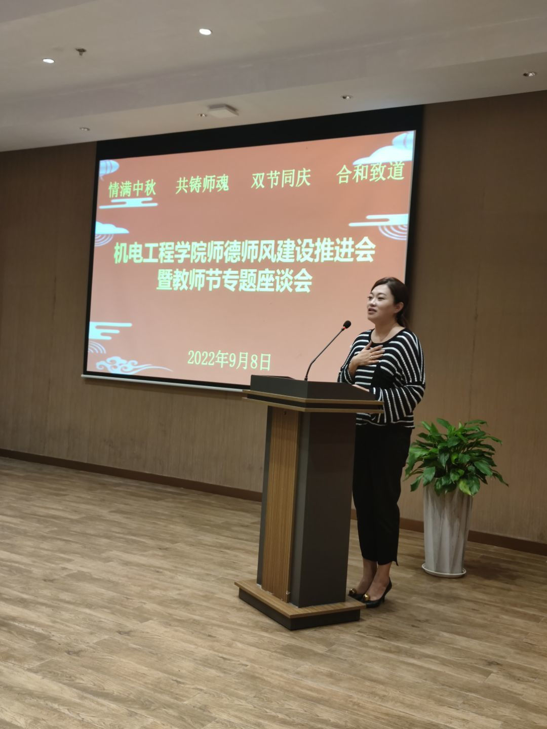 在2022年教师节和中秋节来临之际,机电工程学院9月8日下午组织召开师德师风建设推进会暨教师节专题座谈会,学院全体教职工参加,校长助理李洁老师出席活动。