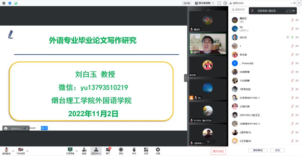 为学习贯彻由教育部出台的《本科毕业论文抽检办法(试行)》文件,认真做好2019级毕业论文选题及各项指导工作,外国语学院于11月2日在线上举行了2019级毕业论文写作指导讲座。讲座由院长助理张丽主持,院长刘白玉教授担任主讲人,2019级全体学生及论文指导教师参加了本次讲座。