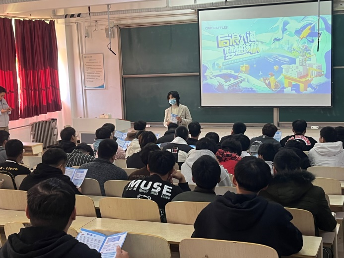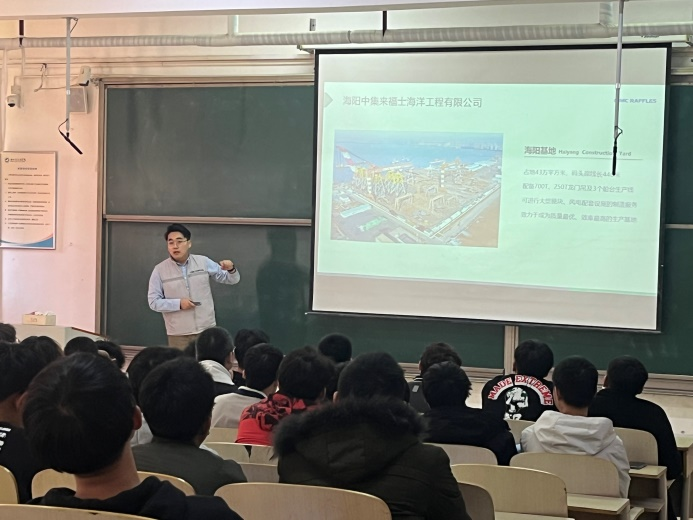 会议开始,袁春静老师向同学们介绍了此次宣讲会的主要内容、目的以及简历注意事项。随后,姜工向同学们介绍了中集来福士的基本情况、产品业务、企业文化、工作岗位、职业规划等,让同学们对中集来福士有了深入了解;接着,姜工与在场同学进行交流,对同学们提出的问题进行了详细的解答,解决了同学们比较关注公司的岗位以及工作地点等方面的问题;最后,姜工指出,公司会根据应聘者的意向职务和个人能力分配工作岗位,并说明了简历投递方式。
