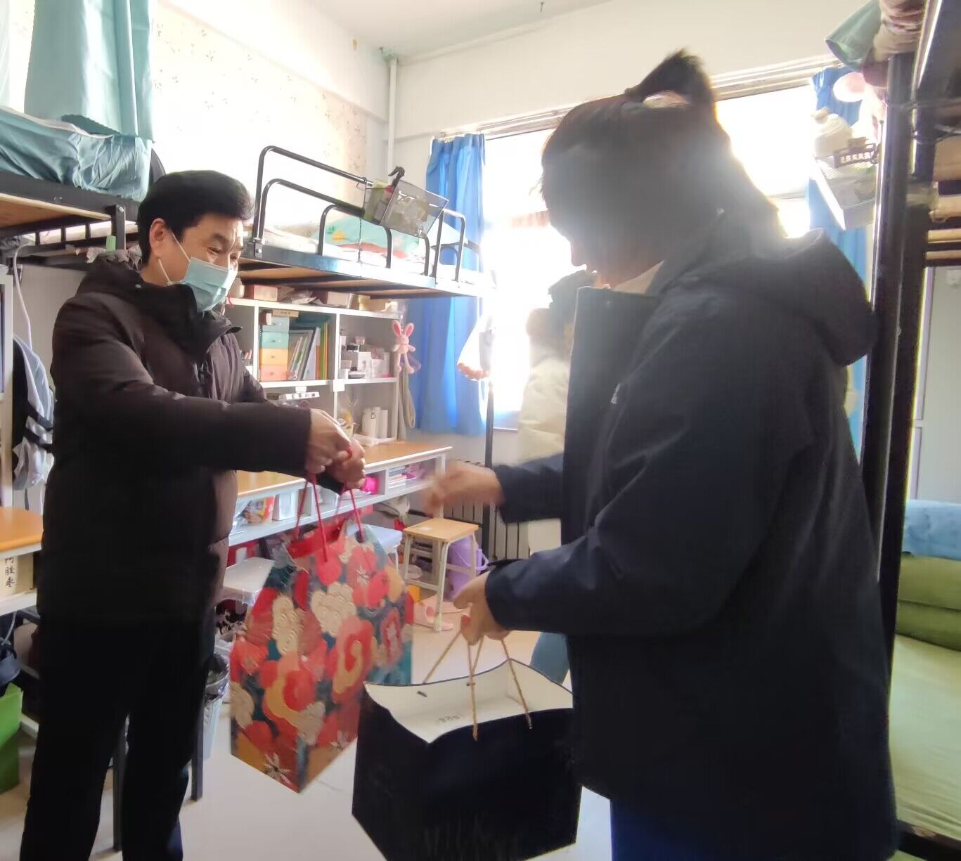 院领导走访宿舍新学期第一天,为同学们送上美好的新学期祝福,了解假期情况,并为学生们发放牛奶、水果等爱心礼包,让学生感受到学院的温暖。
