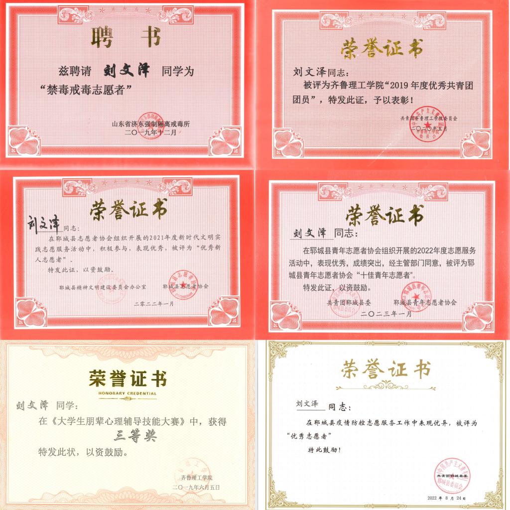 表扬信中写道,刘文泽责任心强,服从安排,为志愿服务事业做出积极贡献,荣获“郓城县优秀新人志愿者”、郓城县疫情防控“优秀志愿者”、郓城县“十佳青年志愿者”等荣誉;曾被山东省济东强制隔离戒毒所聘为“禁毒戒毒志愿者”。
