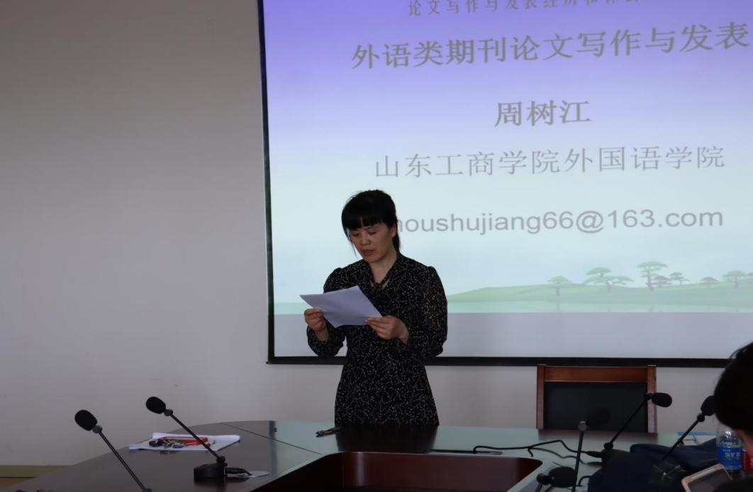 为进一步提升教师科研论文的写作与发表能力,5月16日下午,外国语学院在二教B区会议室开展了题为“外语类期刊论文写作与发表”的学术讲座,本次讲座由山东工商学院外国语学院教授、山东省社科规划项目评审专家周树江教授主讲,由外国语学院院长助理张丽副教授主持,外国语学院常务副院长于巧丽副教授及学院部分教职工参加了此次学术讲座。