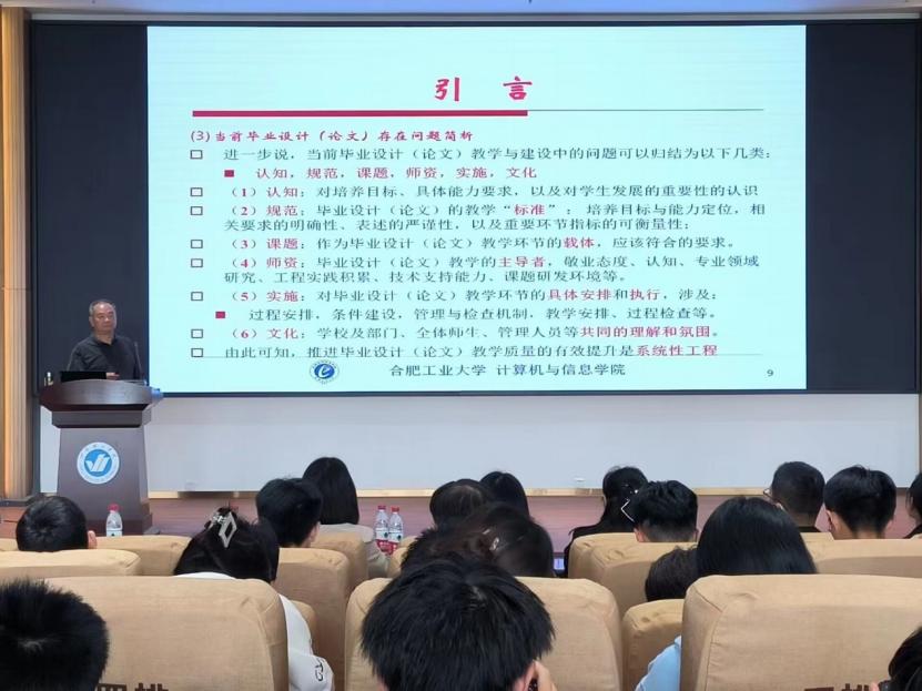 胡学钢教授从毕业设计(论文)的培养目标、教学计划制订的基本要求、教学安排与阶段性要求、毕业设计(论文)课题与培养环境、毕业设计(论文)教学研究与建设等五个方面进行了详细的讲解和阐述。胡教授还结合我校计算机专业毕业设计的案例进行了分析,指出一些共性的问题,并提出了进一步完善的具体建议。毕业设计(论文)教学环节,不仅涉及指导教师和学生的教学过程,更涉及到学校、专业院系等教学管理、质量监控机制、条件建设。毕业设计(论文)是体现学校教学质量和水平、科研能力、教学管理规范化和水平的最重要方面。