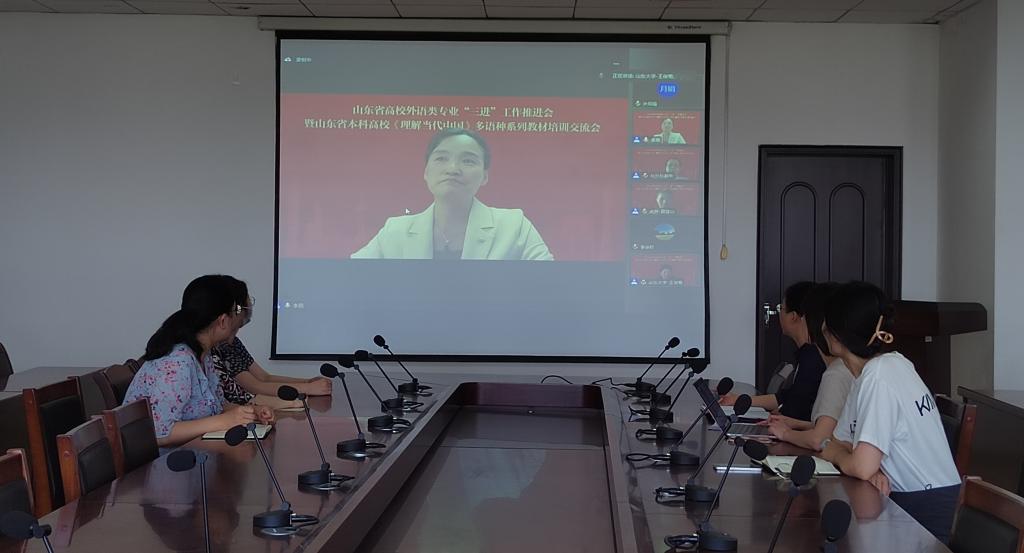 6月16日上午,山东省高校外语类专业“三进”工作推进会暨山东省本科高校《理解当代中国》多语种系列教材交流会于线上召开。外国语学院常务副院长于巧丽,院长助理张丽,日语专业教研室主任许月娟及相关课程骨干教师参加了本次集体学习交流会。
