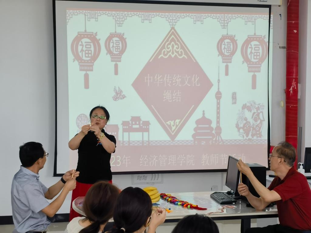 9月8日,在第39个教师节到来之际,经济管理学院邀请中华传统文化专注绳结30余年传承人李媛媛来我院带领教师们体验绳结趣味制作。经济管理学院全体教师参加,活动由经济管理学院党总支书记高照龙主持。