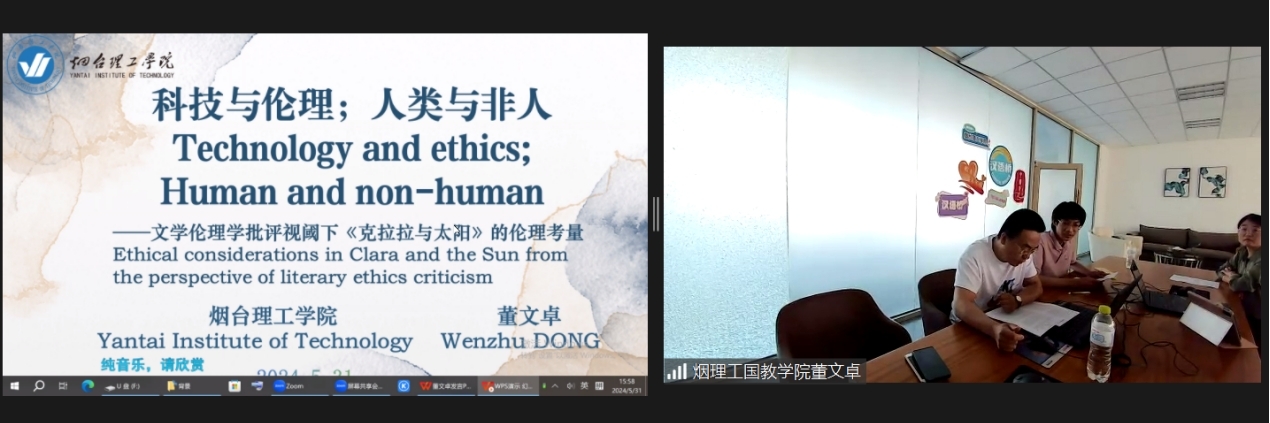 烟台理工学院国际教育学院科研团队葛泳亮、陈晓丹、董文卓等受邀参会,学生董文卓围绕会议论文:《Technology and ethics; human and non-human——The ical considerations of Clara and the Sun in the criticism of literary ethics》作出宣讲汇报。他在报告中以文学伦理学批评为切入点,重点阐述科技与伦理的纠葛。