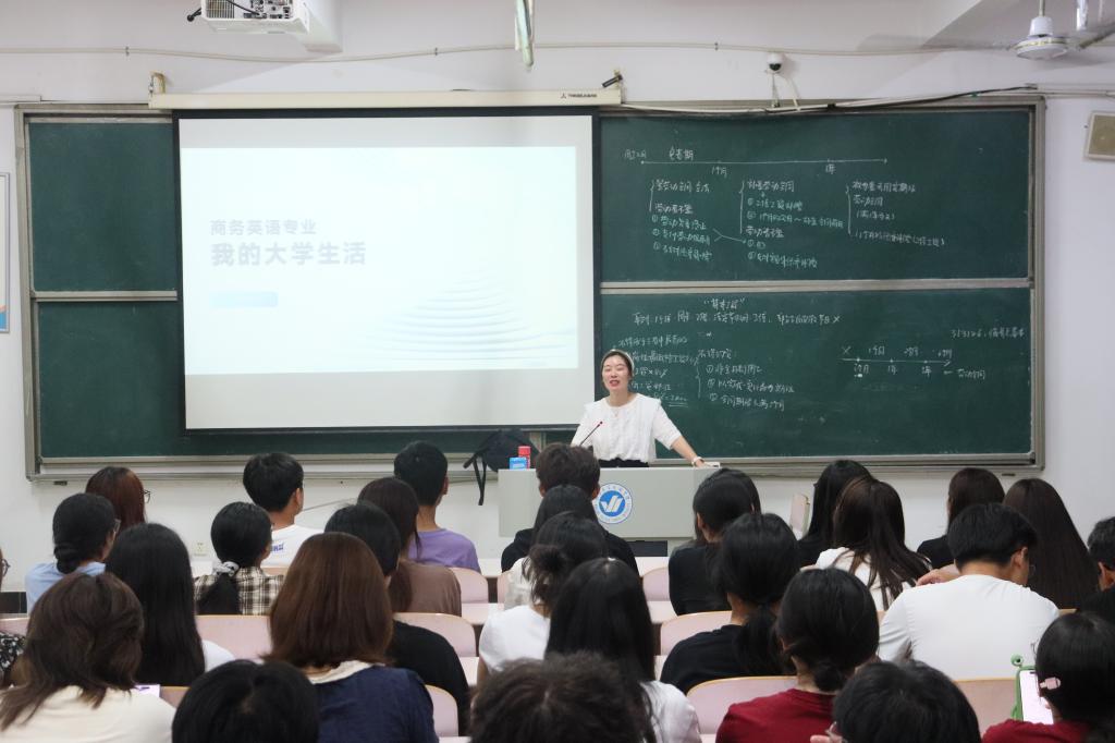 9月13日,外国语学院于二教204举办商务英语专业学业规划讲座,本次讲座由商务英语系主任周均霞主讲,全体商务英语专业2024级新生参加。