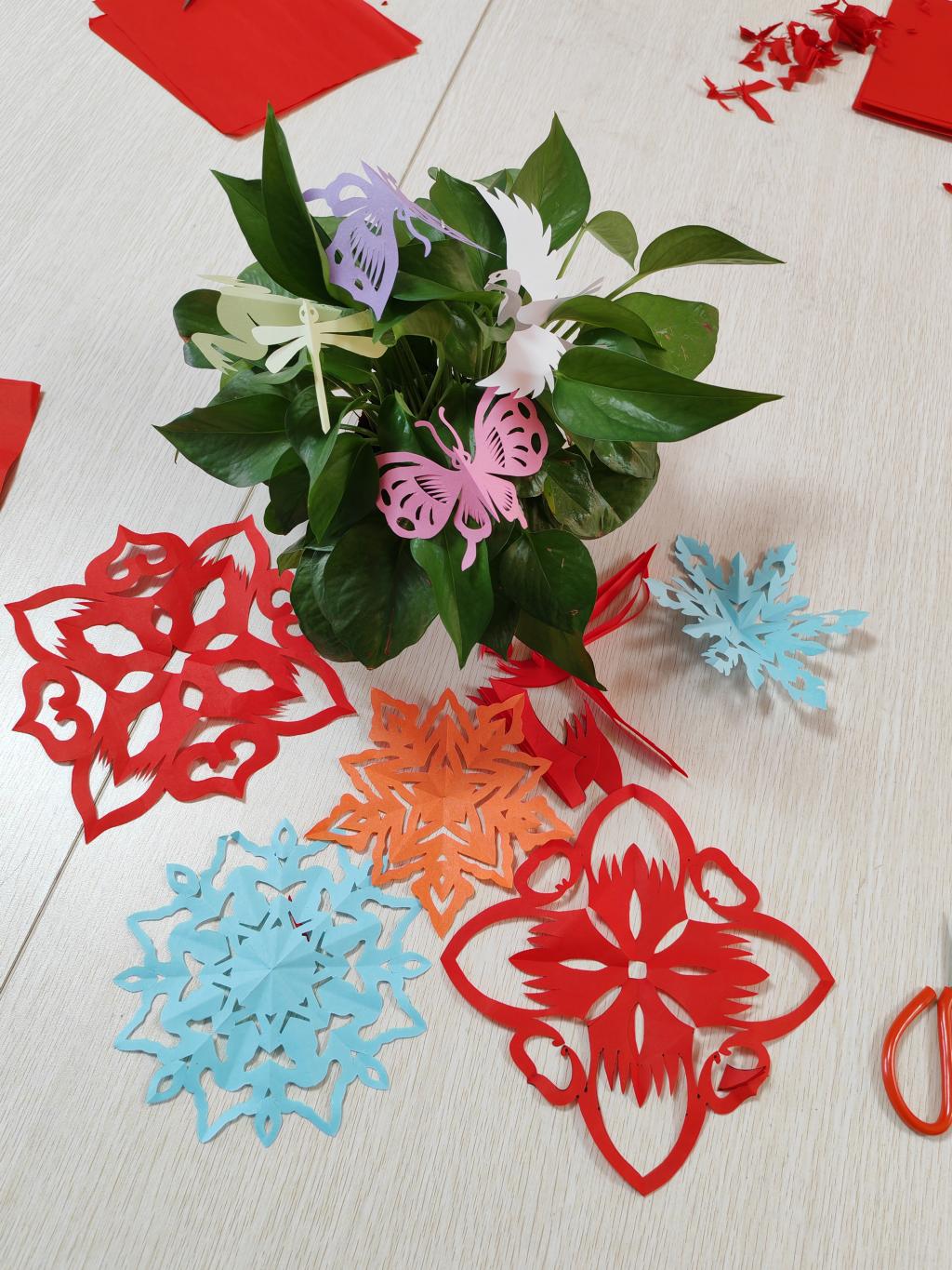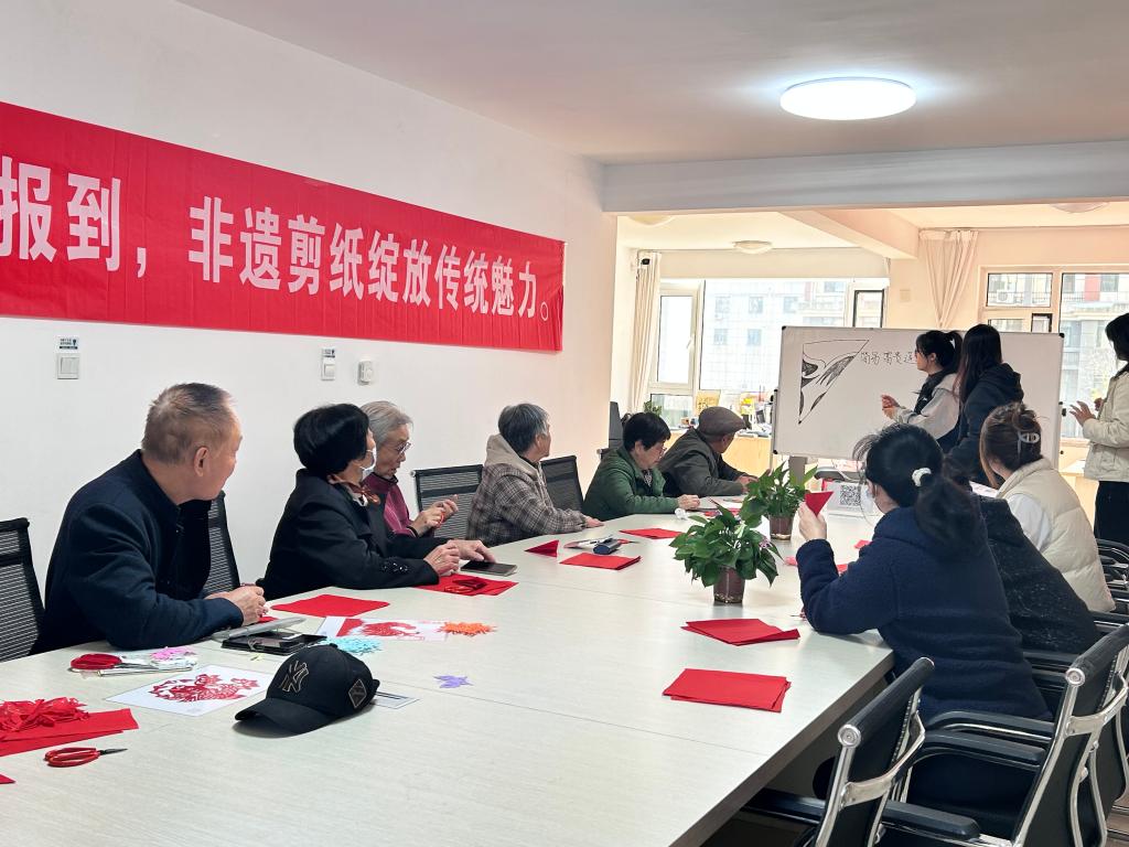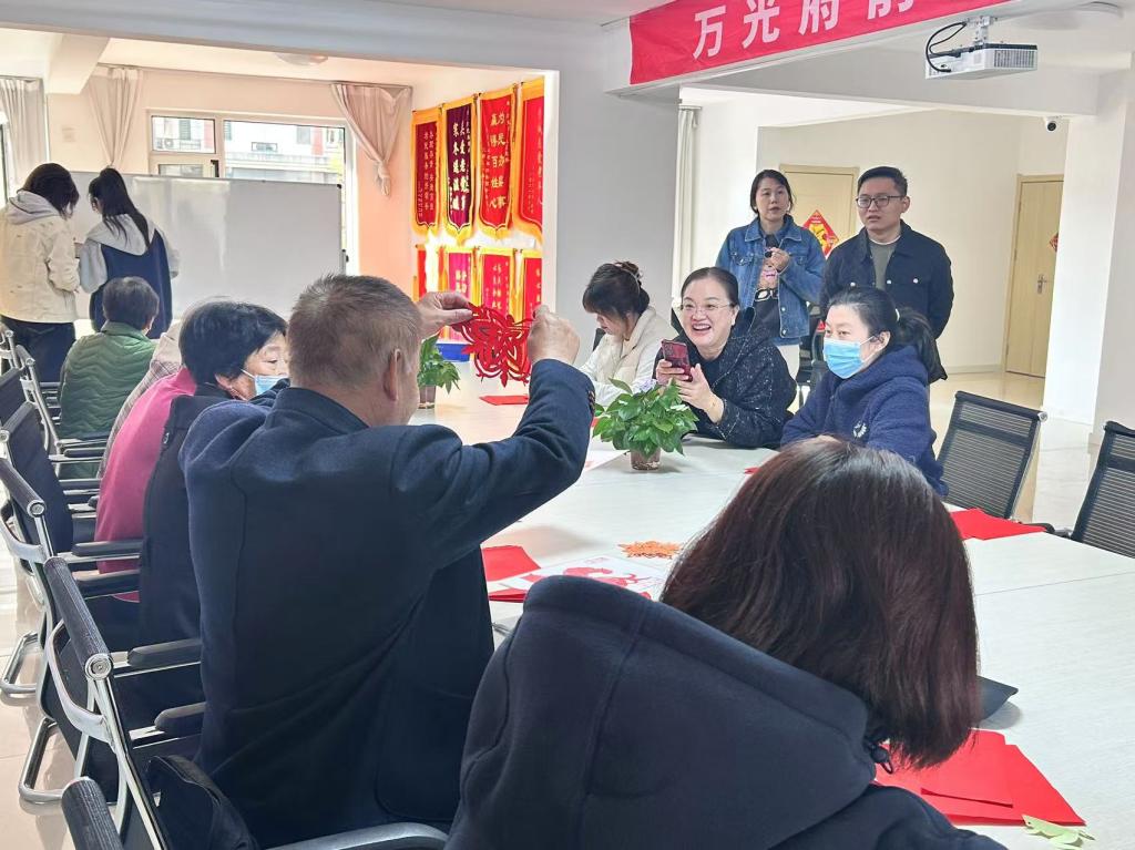在队员们的指导下,大家纷纷拿起剪刀,选取鲜艳的红纸,按照展示的团花模版细心剪裁,放飞想象,自由创作。每一张剪纸都体现着大家对生活的热爱与对未来的美好期许,剪纸在此刻不仅仅是一种技艺展示,更成为了连接彼此、传递正能量的桥梁。