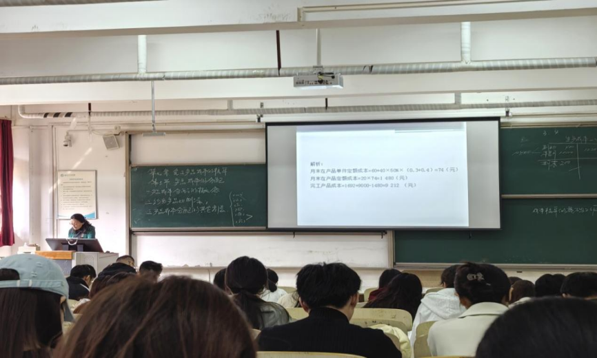 《成本会计》是会计与金融学院会计学一流本科专业的一门核心课程,在会计学科及企业管理中占据着举足轻重的地位,旨在培养学生掌握成本核算的原则、程序、方法等理论知识,并通过实训操作、案例分析等,熟悉实际操作技能,更加全面的理解企业成本核算的整个流程,为企业提供及时可靠的成本信息,做出更加科学合理的决策和管理提供支持,为企业持续发展和竞争力提升助力。贾俊荣老师通过课堂习题带领学生回顾了上节课的内容,以更好巩固所学知识,从公式原理到各型题干的场景应用,详细拆解完工产品成本的核算问题。同时,将生活中通俗易懂的案例与相关的专业知识相结合,并采用课堂互动的方式,让学生对专业知识的了解更加细致透彻。