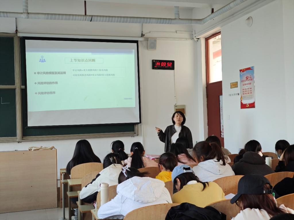 《审计基础》课程是会计与金融学院审计学专业的核心课程,也是其他相关专业如工商管理专业与政治学、经济学与哲学专业的学科基础课程。对于培养学生的审计专业素养和实务操作能力至关重要。俞宏老师先以练习题的方式对上节课的知识进行了巩固,并对风险评估的定义、作用以及程序进行了详细的讲解,让同学们了解审计单位的目标、战略以及可能导致重大错报风险的相关经营风险。俞宏老师强调,学习审计学不仅要掌握知识点,更多的是掌握思维和方法,学会迁移运用,学无止境,只有掌握了思维方法,才能更好的应用于其他的例子。