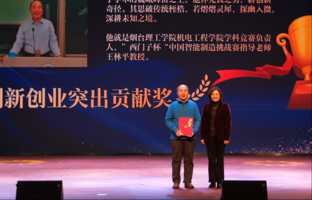 烟台理工学院机电工程学院学科竞赛负责人“西门子杯”中国智能制造挑战赛指导老师王林平教授获得“创新创业突出贡献奖”,校长助理李洁为王林平教授颁奖;学院聘请零跑汽车有限公司华中大区总监张宗平为“校外创新创业导师”,刘加光院长为张宗平颁发聘书;招生就业处副处长褚亮辉为单瑞霞、贾森、李志娟、袁春静、袁港、孟宪辉老师颁发了“校内创新创业导师”;创新创业学院院长莘海东为夏侯玉玺、万兴振、邱建华同学颁发科创之星奖,他们凭借在创新创业竞赛中取得的优异成绩而备受瞩目。