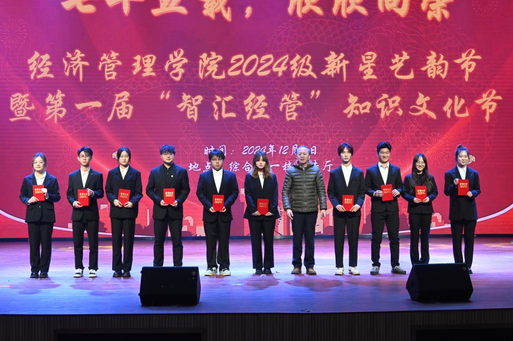 12月6日,经济管理学院于综合楼一楼报告厅盛大举行“七十五载,欣欣向荣”新星艺韵节暨第一届 “智汇经管” 知识文化节。副校长苏春景,校团委副书记臧延云,招生就业处副处长褚亮辉,文法学院党总支书记曹钊庆,食品与生物工程学院党总支副书记温少斐,国际教育学院党支部书记于丽方,经济管理学院院长华吉鹏,党总支书记邓之增,副院长殷晓彦、王崇红及经济管理学院全体老师出席活动,共同见证这场文化与知识交融的盛宴。
