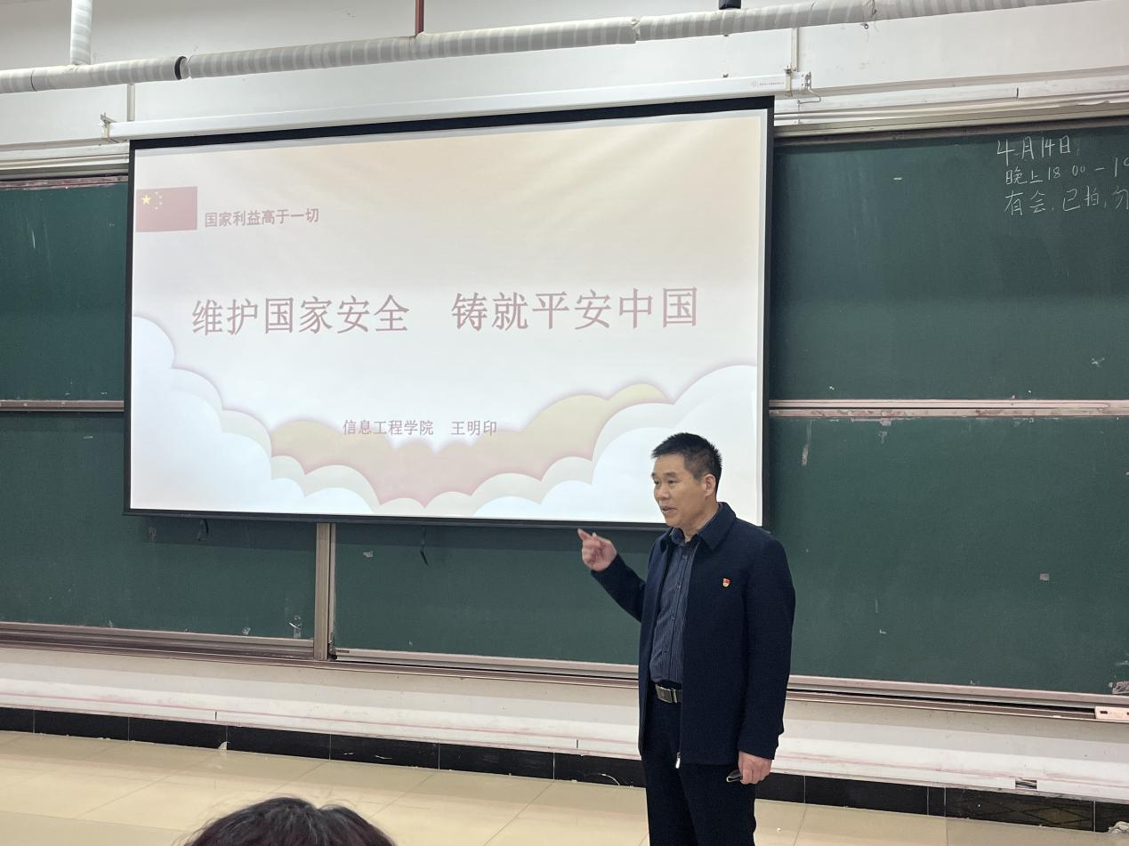 为深入贯彻总体国家安全观,增强师生维护国家安全的责任感和使命感,近日,信息工程学院于一教101举办“维护国家安全,铸就平安中国”主题讲座。学院党总支副书记王明印,团总支书记祝箐、全体辅导员以及24级学生参加活动。
