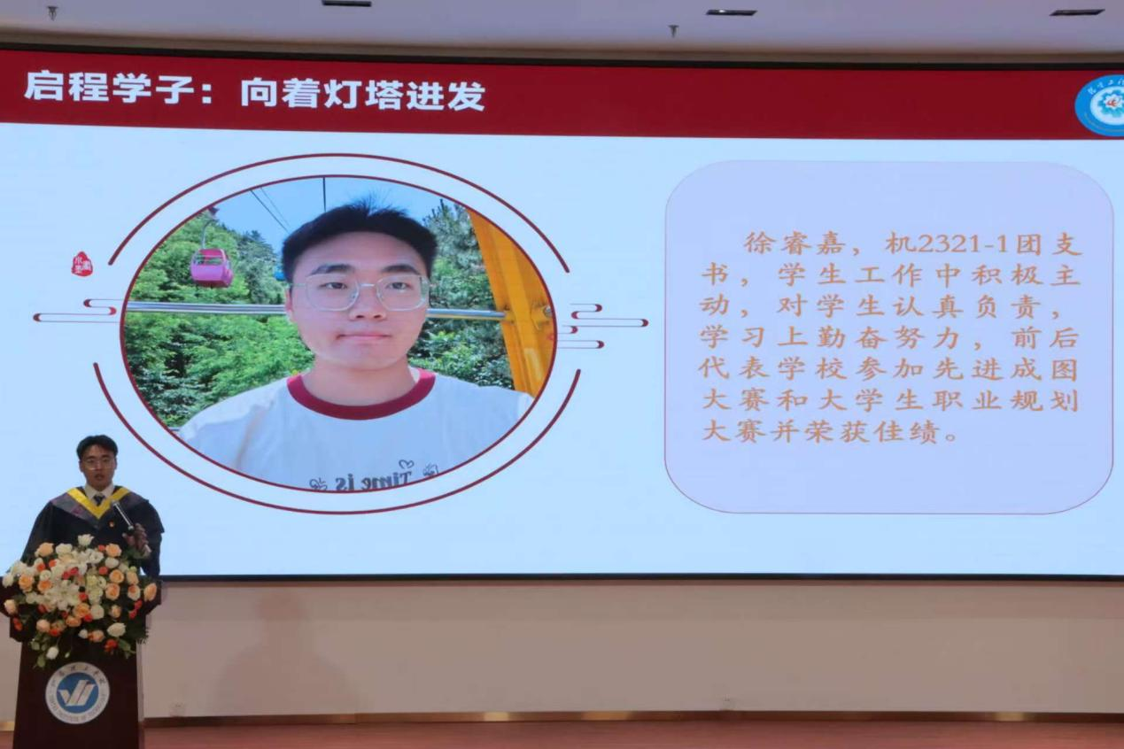 徐睿嘉以“追光者,终成光”为题,分享了自己在机电学院的成长故事。他坦言:“从踏入校园的第一天起,我便被这里的严谨学风与创新精神深深感染。每一次课堂讨论、每一场项目实践,都让我感受到知识的力量与团队的温度。”他以“追光者”自喻,呼吁毕业生:“愿我们永远保持对未知的好奇、对理想的热忱,在各自的领域中发光发热,成为照亮他人的那束光!”