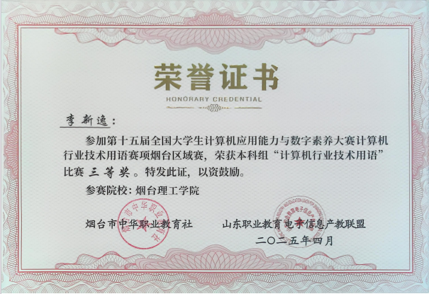 在本科组计算机行业技术用语赛项中,张开越同学获得二等奖;李新逸、高茂琪同学则拿下三等奖;在人工智能行业技术用语赛项中,王娜同学在该赛项中获得三等奖,展现了学校在人工智能领域相关教学的成效。