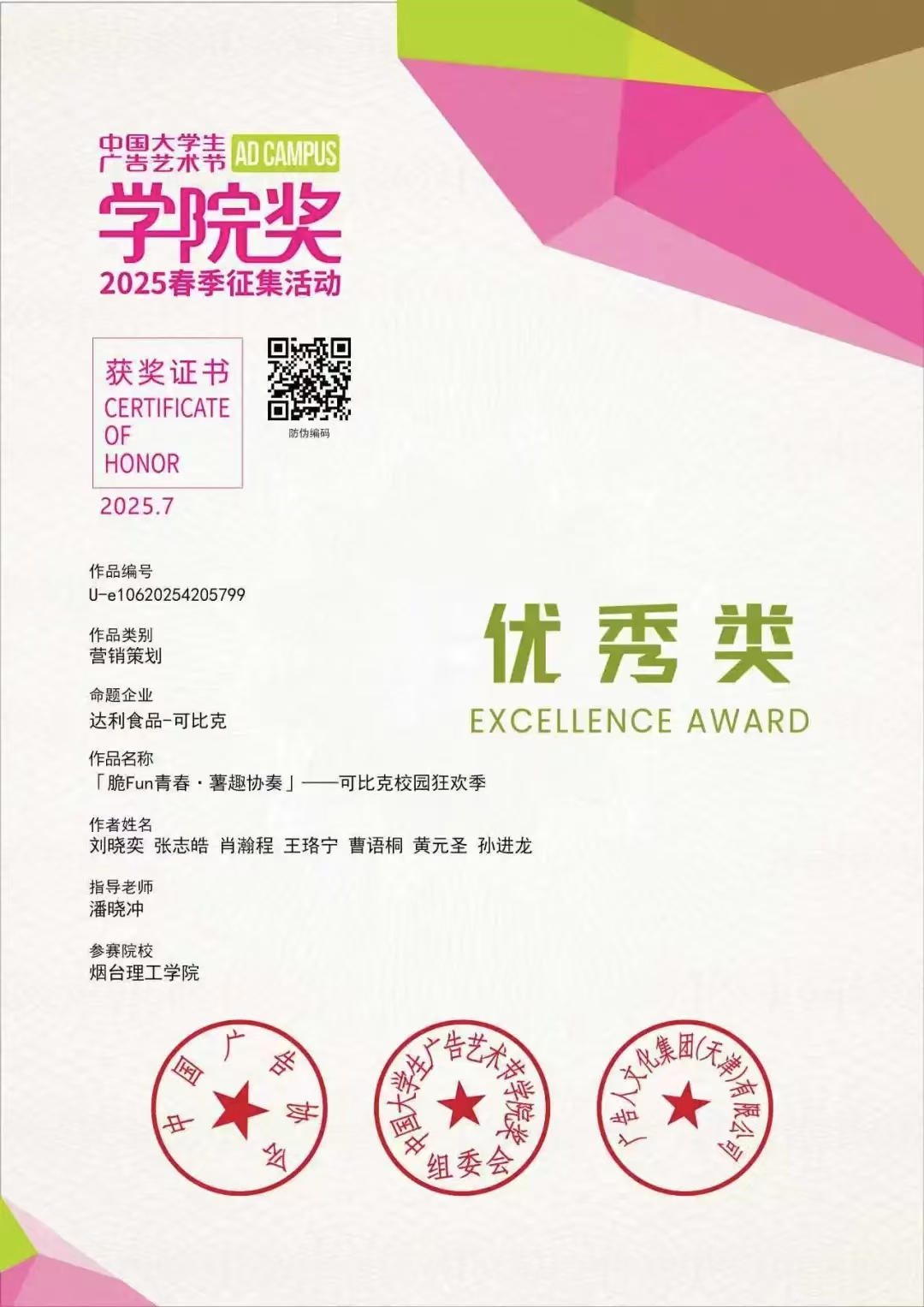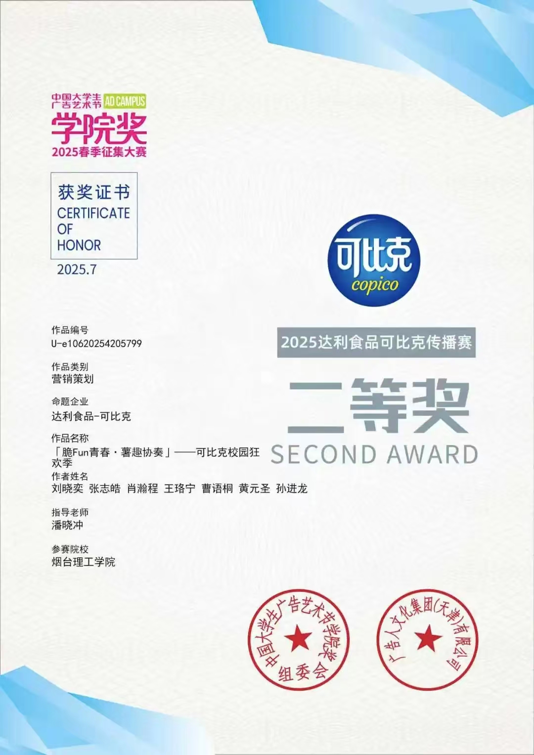在中国大学生广告艺术节学院奖2025春季征集大赛中,营销策划作品《「脆Fun青春·薯趣协奏」——可比克校园狂欢季》在达利食品可比克传播赛中斩获二等奖,同时在常规赛中荣获优秀类奖项,展现出过硬的专业实力与创新思维。
